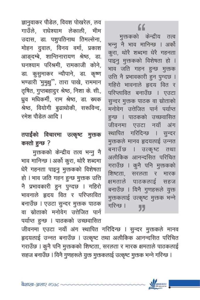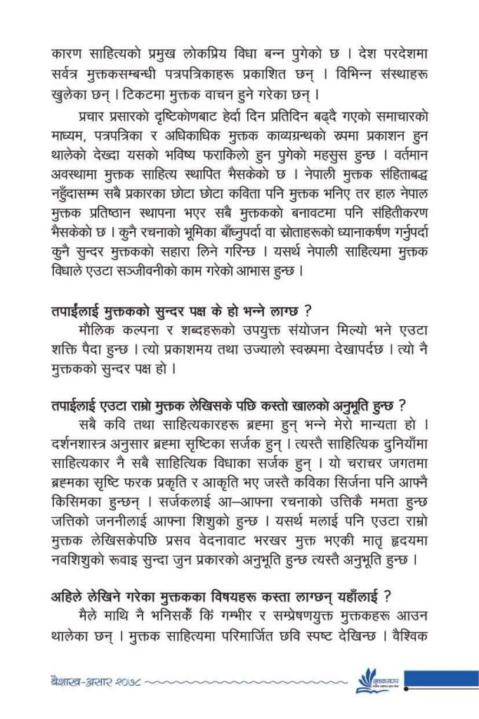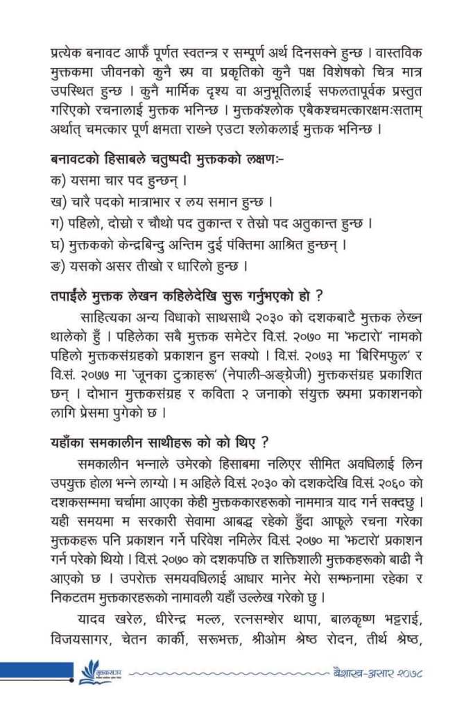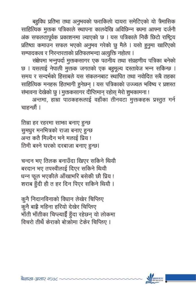 सम्पादक निशा के सी ज्यूले मुक्तकसागर त्रैमासिक साहित्यिक पत्रिकाको लागि म तीर्थराज अधिकारीसंग लिनु भएको अन्तर्वार्ता उक्त पत्रिकाको १२रौं अंकमा प्रकाशन गरिदिनु भएकोमा सम्पादक एवं मुक्तकसागर परिवारप्रति हार्दिक आभार व्यक्त गर्दछु।